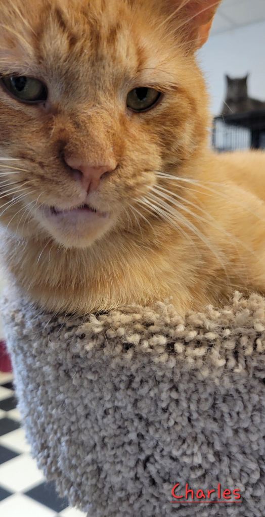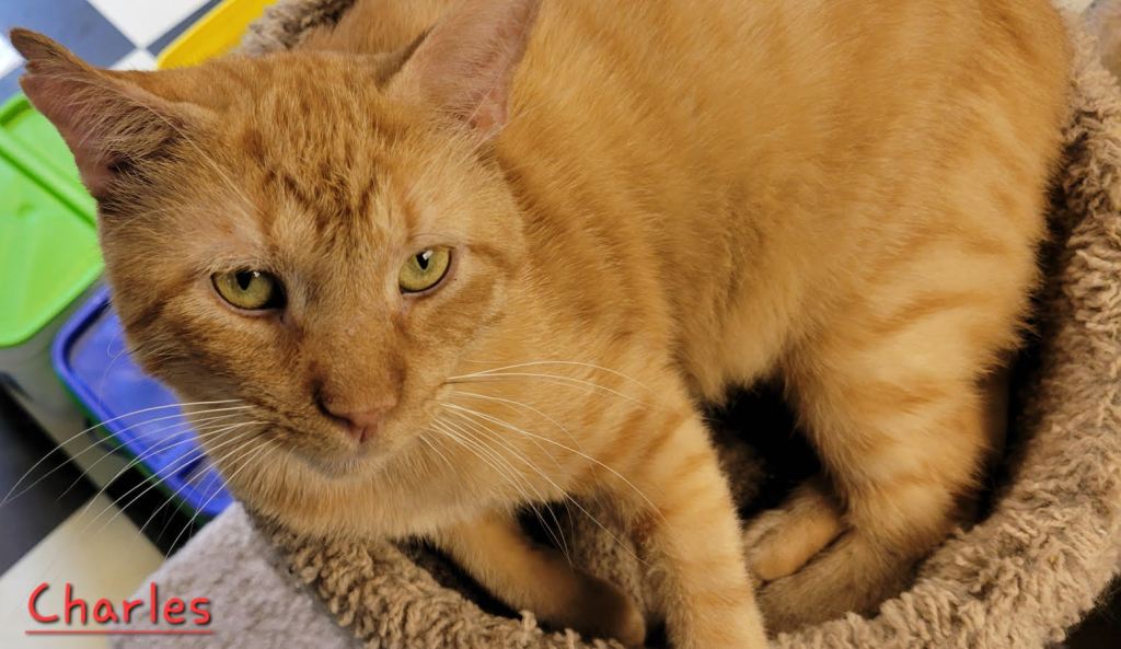 This big sweet guy is 3 years old. Charles likes brooms, specifically brooms in motion. If you want to sweep the floor, he’ll be glad to help you move the broom around. He also likes a good grooming session with one of his buddies. Charles is fiv+.