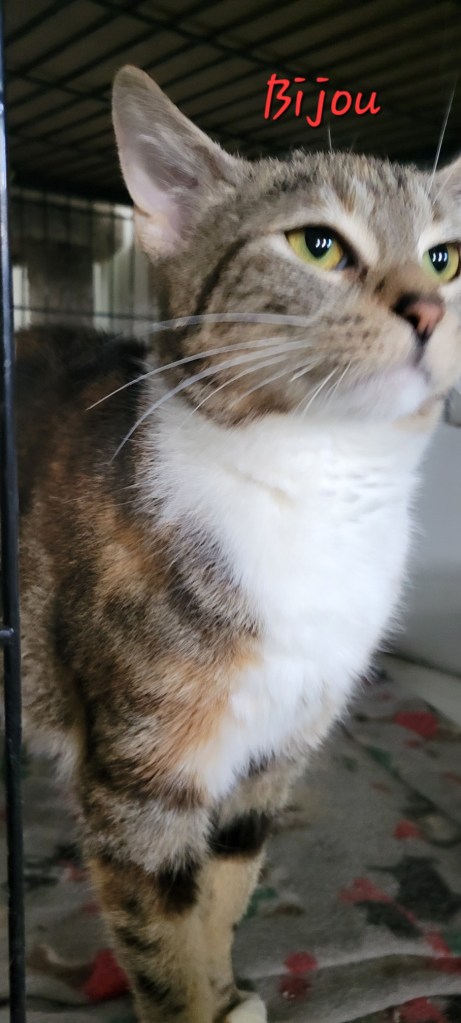 Three year old Bijou has a slight identity problem. Is she a calico? A tabby? We’re not sure, so we call her a tabico. Even though she’s gorgeous, she’s not a diva, demanding a lot of attention. She’s happy just to hang out and let you do your thing.