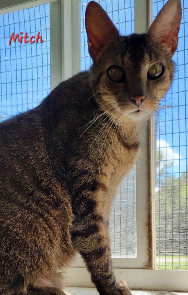 Loveable Mitch is nine years old and quite a character. Active, affectionate, and likes to pat your face for attention. If that doesn’t work, his next tactic is to jump up on your shoulders and poke his handsome Abyssinian face up to yours.